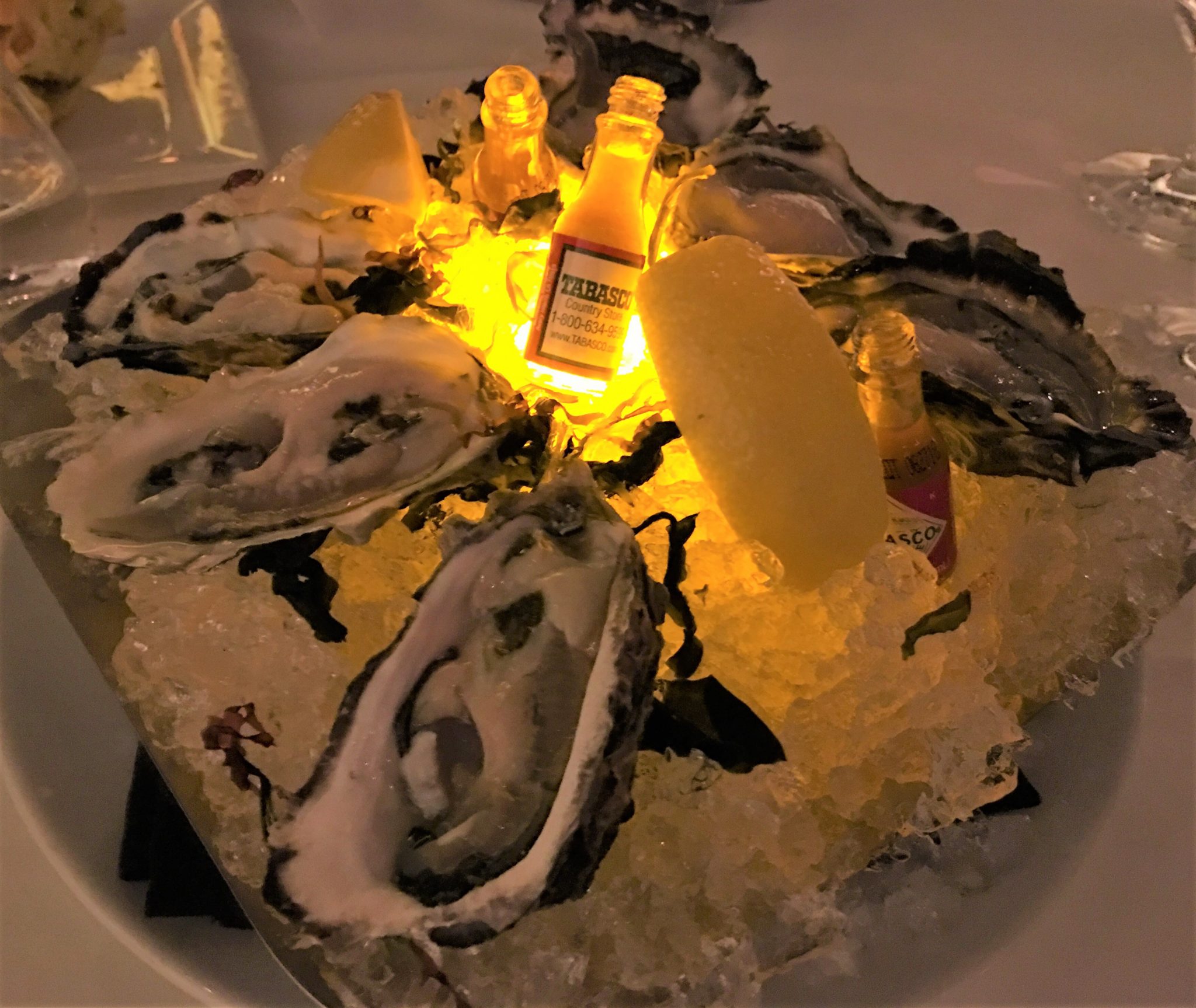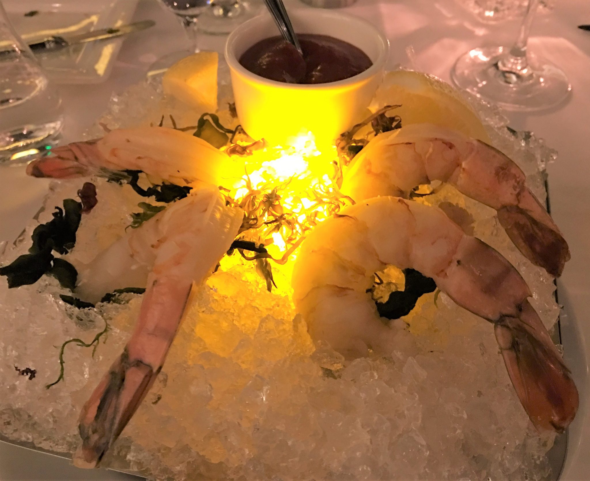 前菜にぷりっぷりぶり半端ない蒸しジャンボ虎海老と新鮮な生牡蠣を。